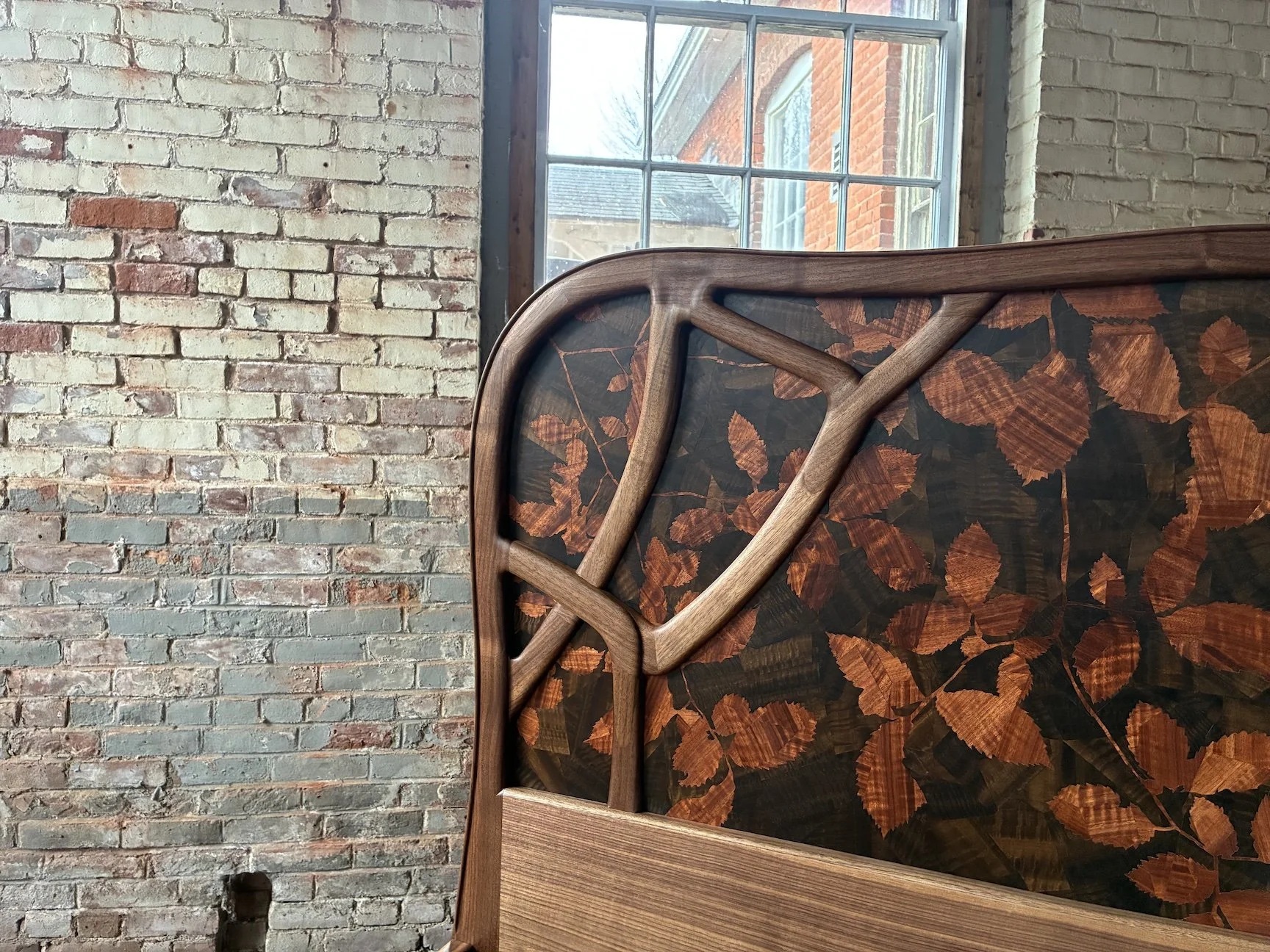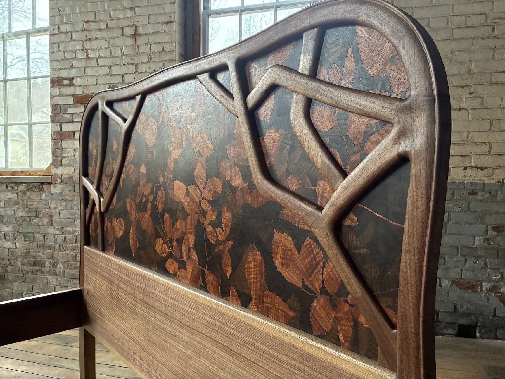 This piece evokes the experience of looking through the forest. A fractal marquetry leaf theme comprises the background panel. It is overlayed with sculptural, organic branches that contrast the more literal leaf structures. The frame is walnut and the leaves etimoe and eucalyptus.